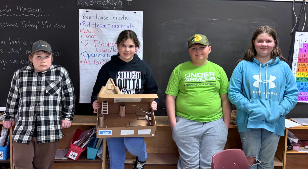 Near North District School Board students had their building skills and imagination put to the test by the North Bay Society of Architects (NBSA) for this year’s Climate Change Challenge. The challenge set out by NBSA was to create a shelter for their “3 little Northern Ontario pigs” to withstand one of three climate change impacts. Students at Northern, Almaguin Highlands, West Ferris and F.J. McElligott Secondary Schools, as well as Sunset Park, Vincent Massey and Mattawa Public elementary schools all participated. The students’ task was to research, plan, design, prepare drawings, create a written narrative and construct a shelter to withstand fire, water or wind. Groups were given kits containing biodegradable construction materials and an assigned climate change impact. Students were also expected to collect recycled cardboard from home to add to the projects.